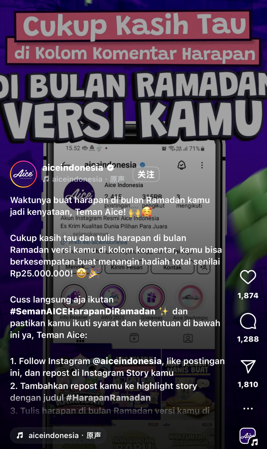 发布的内容多样化,比如最近的斋月期间艾雪就做了个许愿抽奖,拿出2500万印尼盾当奖金,让用户带话题#harapanramadan发帖,效果直接拉满。活动吸引了超10万用户参与,这在快消品社媒运营里算得上是中上水平了。