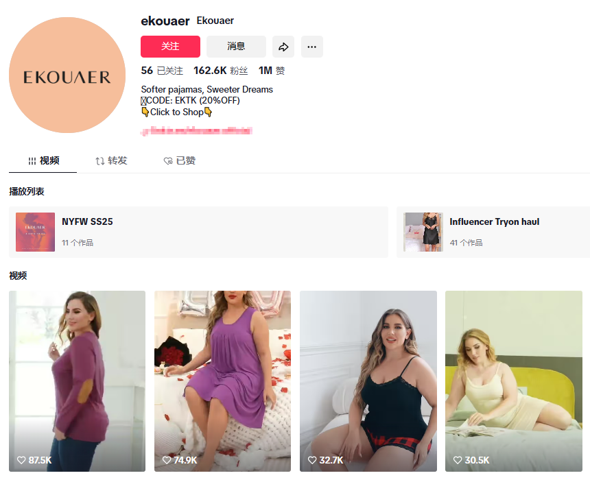 在TikTok平台上,EKOUAER品牌通过强调真实感和包容性,吸引了广泛受众,目前积累了16.26万粉丝,获赞量达到了100万。其发布的视频内容涵盖了不同肤色、体型和年龄层的模特,展示了居家办公、周末休闲、运动健身等多种场景下的穿搭,可以满足不同受众的需求。
