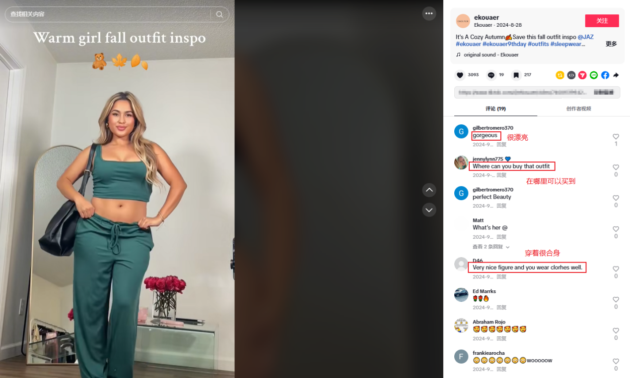 拥有12.12万粉丝的TikTok达人@realbadjaz便为EKOUAER品牌拍摄了上身展示的产品测评视频,引发了用户的高度兴趣。许多用户在视频下评论“很漂亮”“身材很好,穿这些衣服很合身”,甚至主动询问购买渠道,推动了产品的转化。