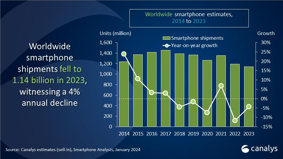 realme品牌的爆发恰逢全球智能手机市场的结构性调整,彼时全球智能手机市场正因换机周期延长而增长疲软,根据第三方数据,2023年全球智能手机出货量降至11.4亿部,年同比下降4%。