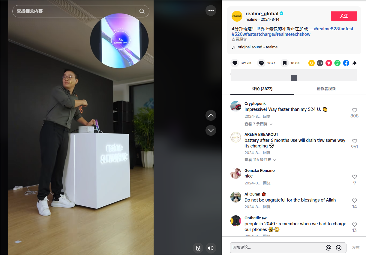 以品牌欧洲账号@realmeglobal为例,针对欧美消费者对续航与快充技术的高度关注,该账号在内容展示时多以技术场景化为主,其发布的“4分钟极速充电”视频正是击中了欧美用户的痛点,视频在发布后迅速获得了超1240万的播放量。