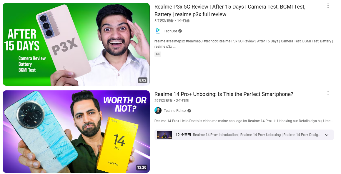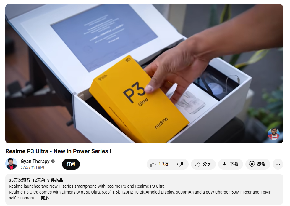 例如,在YouTube博主@Gyan Therapy发表的关于Realme P3 Ultra 的一篇深度测评视频,为品牌带来了35万次的播放量,吸引了大量的用户评论互动。
