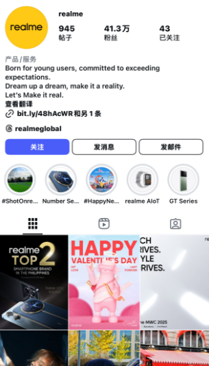 在realme品牌的多平台布局中,Instagram承担着“品牌美学中枢”的角色,通过高质感视觉叙事,将手机从功能性工具升维为潮流文化符号。目前,其全球主账号@realme已积累41.3万粉丝,而区域账号矩阵(如@realmeglobal、@realmesea)总粉丝量突破120万,成为品牌撬动高价值用户的关键杠杆。