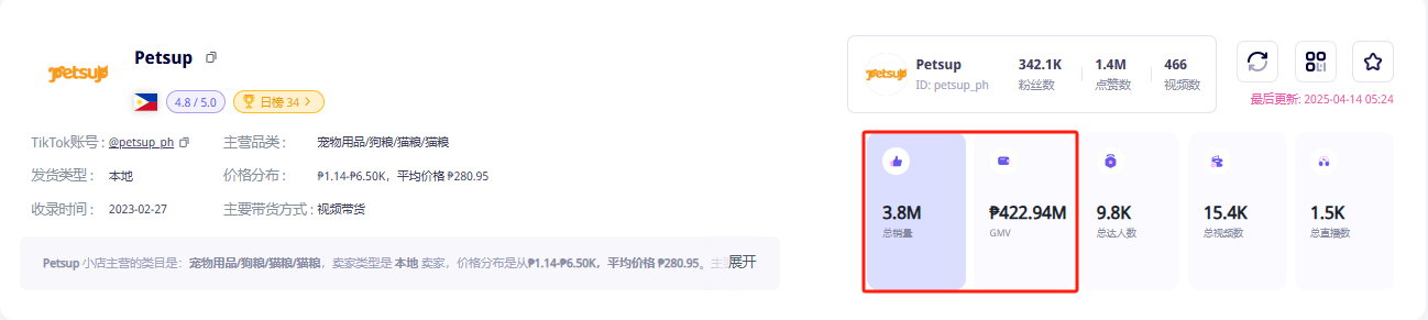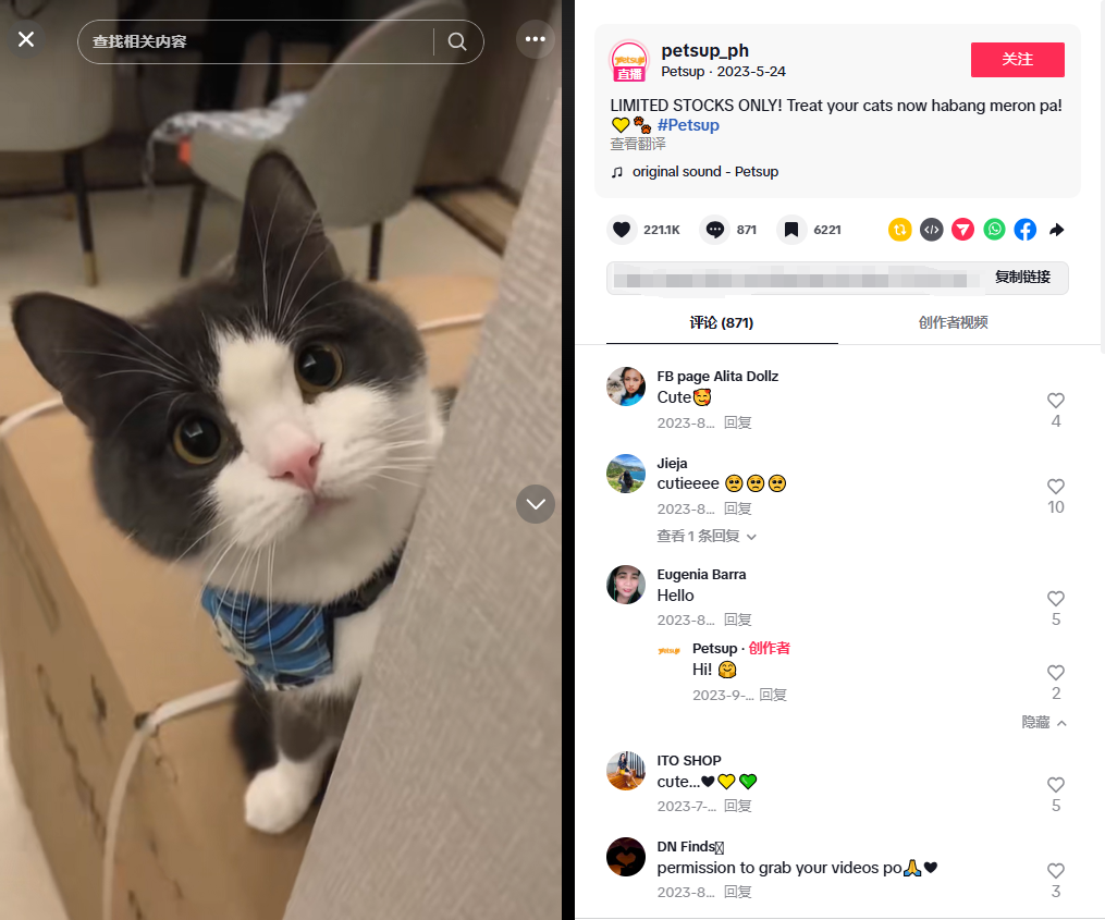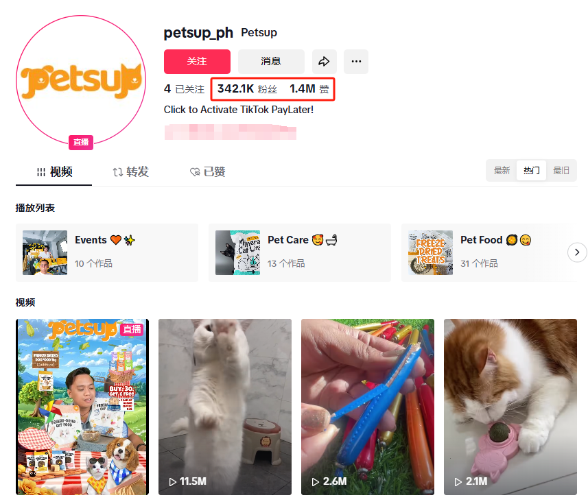 截至目前,其官方账号@petsup_ph粉丝数34.21万,总点赞量140万。