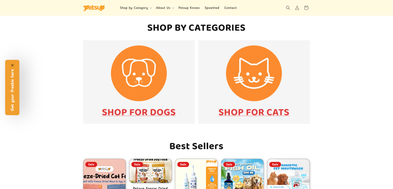 除了社媒布局,Petsup还搭建了品牌独立站,整个网站采用明亮的暖黄色调,营造出温馨的购物氛围,让人一打开就感觉舒服。