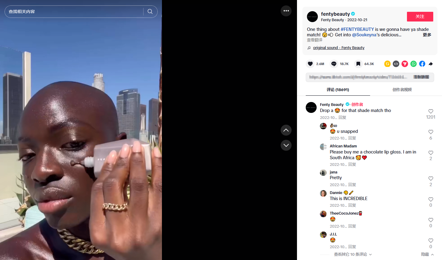 美妆品牌Fenty Beauty在TikTok上的评论区互动频繁。品牌方不仅会迅速解答用户关于产品使用技巧、色号如何挑选等问题,还会率先发布一些有趣的评论来吸引用户的参与和互动。