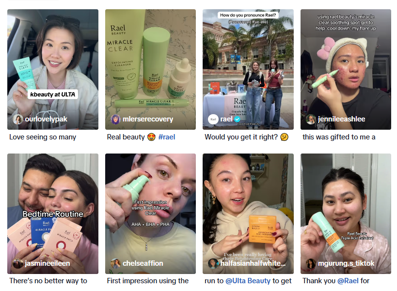 护肤品牌Rael 通过开展与品牌同名的话题挑战活动,激励用户分享个人使用经历,并从中选取优质素材制作品牌广告。