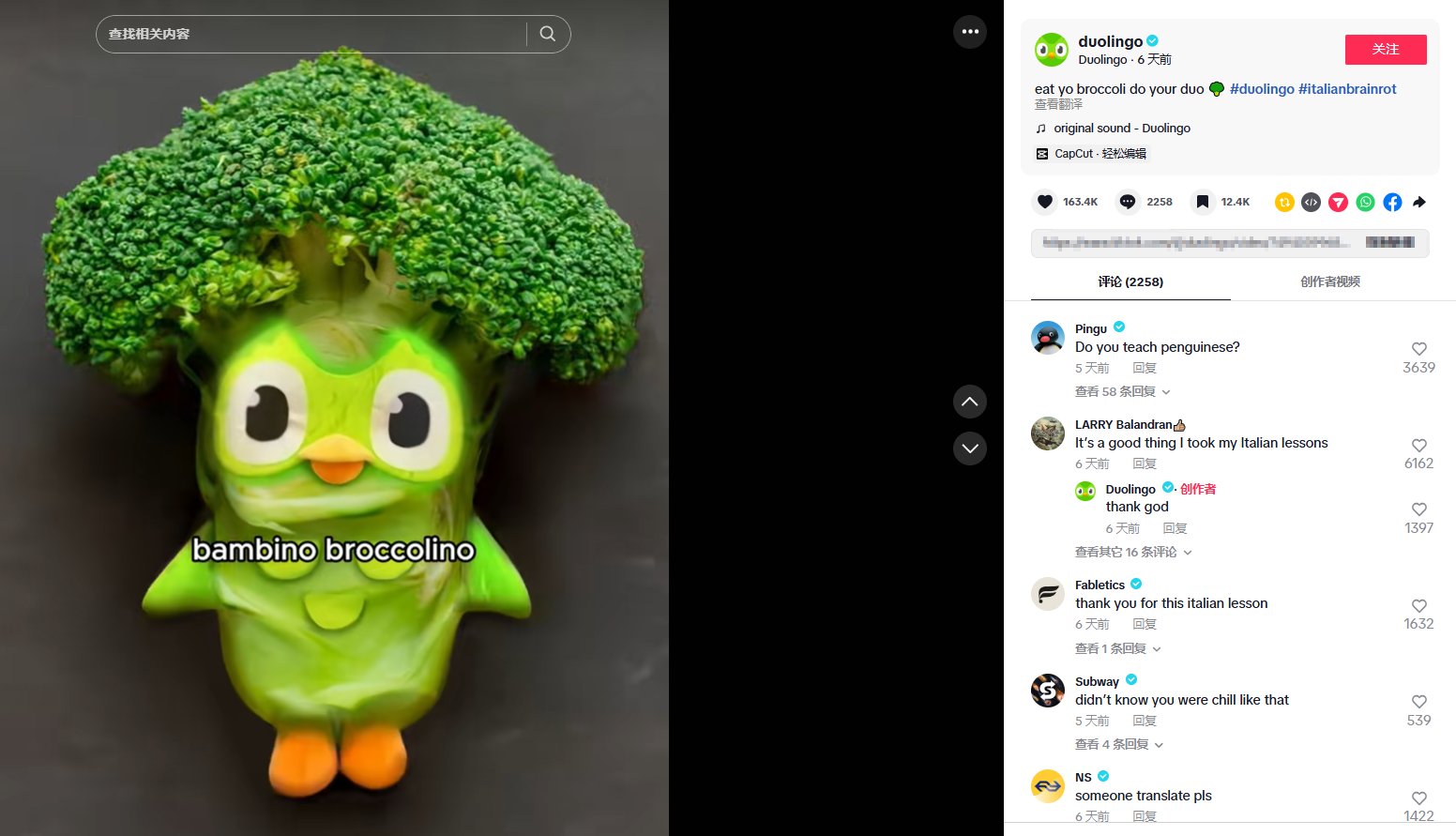这种陪伴式的情感输出,使Duolingo的TikTok账号粉丝量大幅增加,截至目前,粉丝量已经达到了170万。