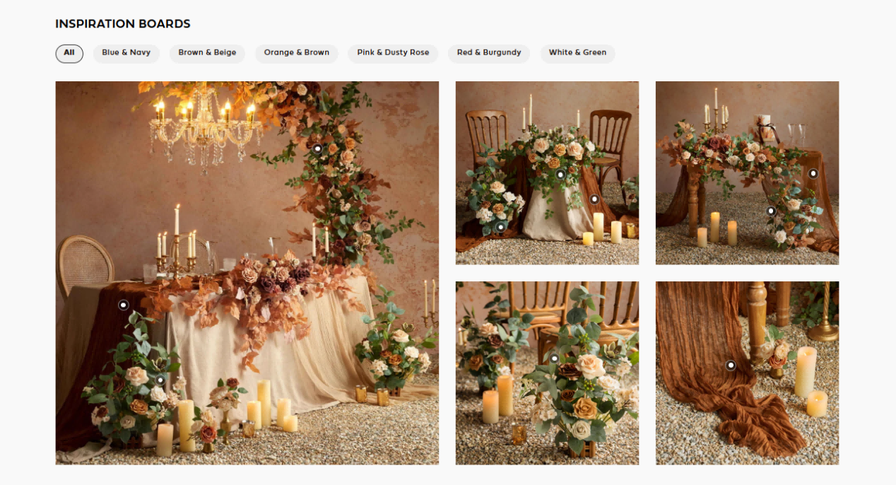 目前品牌在该平台拥有21.5万粉丝,通过发布主题配色方案和创意搭配图集,为备婚新人提供实用参考。比如一组"秋日婚礼花艺灵感"的图集,巧妙将仿真花与季节元素相结合,既展示了产品多样性,又提供了可直接复制的婚礼装饰方案。