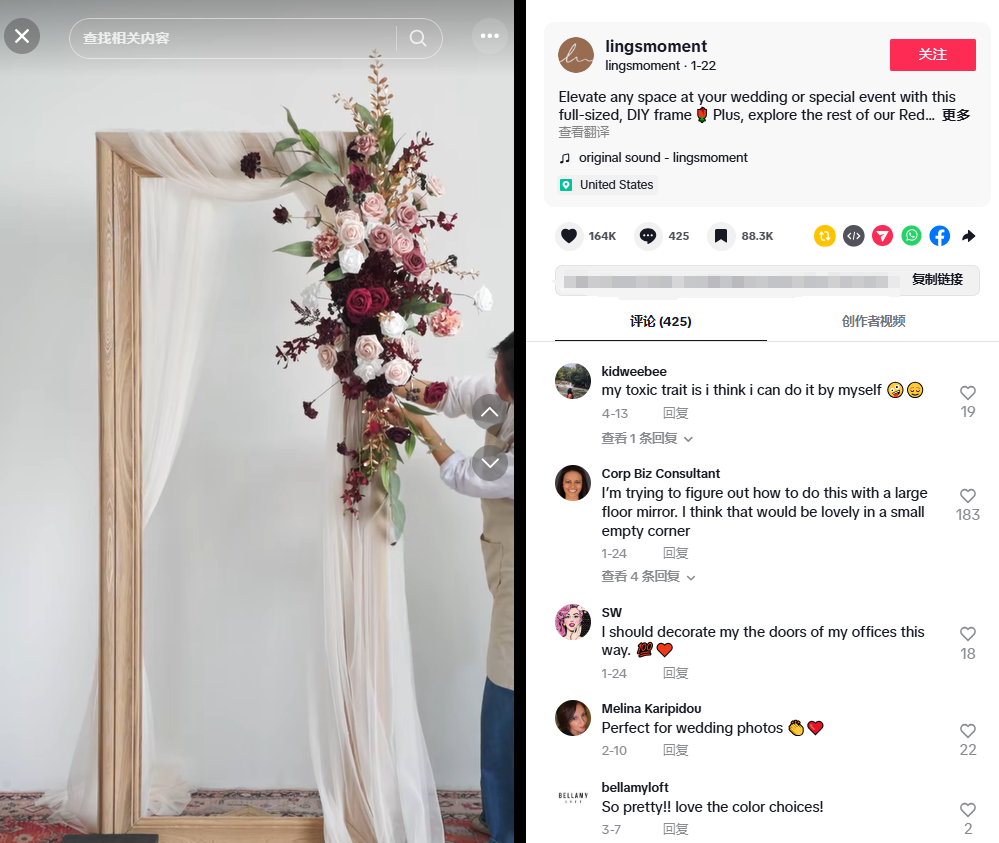 该账号日常发布的"DIY花墙装饰"、"手捧花制作"等教程视频,完美契合了备婚人群的需求。其中一条展示如何用仿真花装饰婚礼拱门的视频表现尤为突出,播放量突破650万大关。视频评论区有不少用户留言赞叹:"太漂亮了,简单又优雅,已经推荐给新娘了。"这种真实的用户反馈,不仅证明了内容的吸引力,更带来了可观的传播效果。