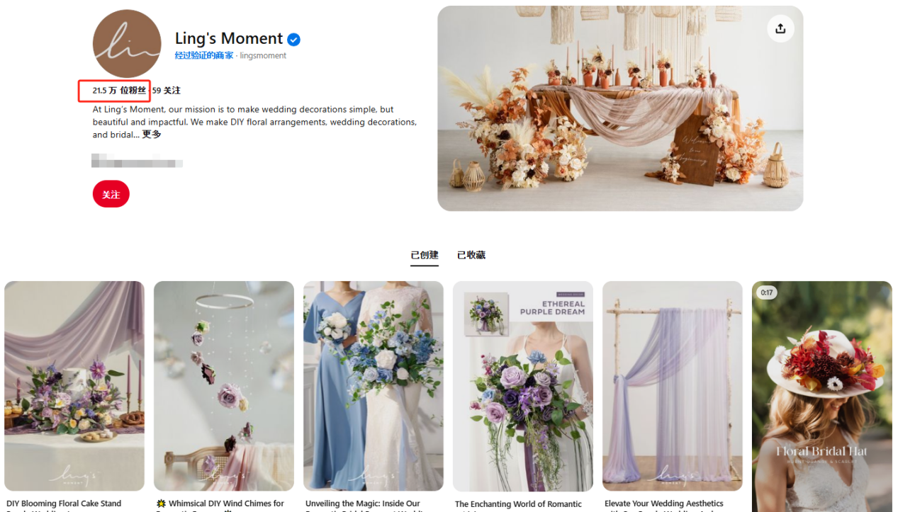 作为美国新人获取婚礼灵感的主要平台,Pinterest也是Ling's Moment的重点运营阵地。