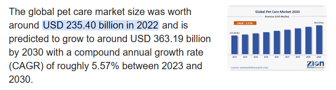 据Zion Market Research数据显示,全球宠物用品市场规模预计将在2030年将增长至约3631.9亿美元,在2023年至2030年期间,复合年增长率约为5.57%。