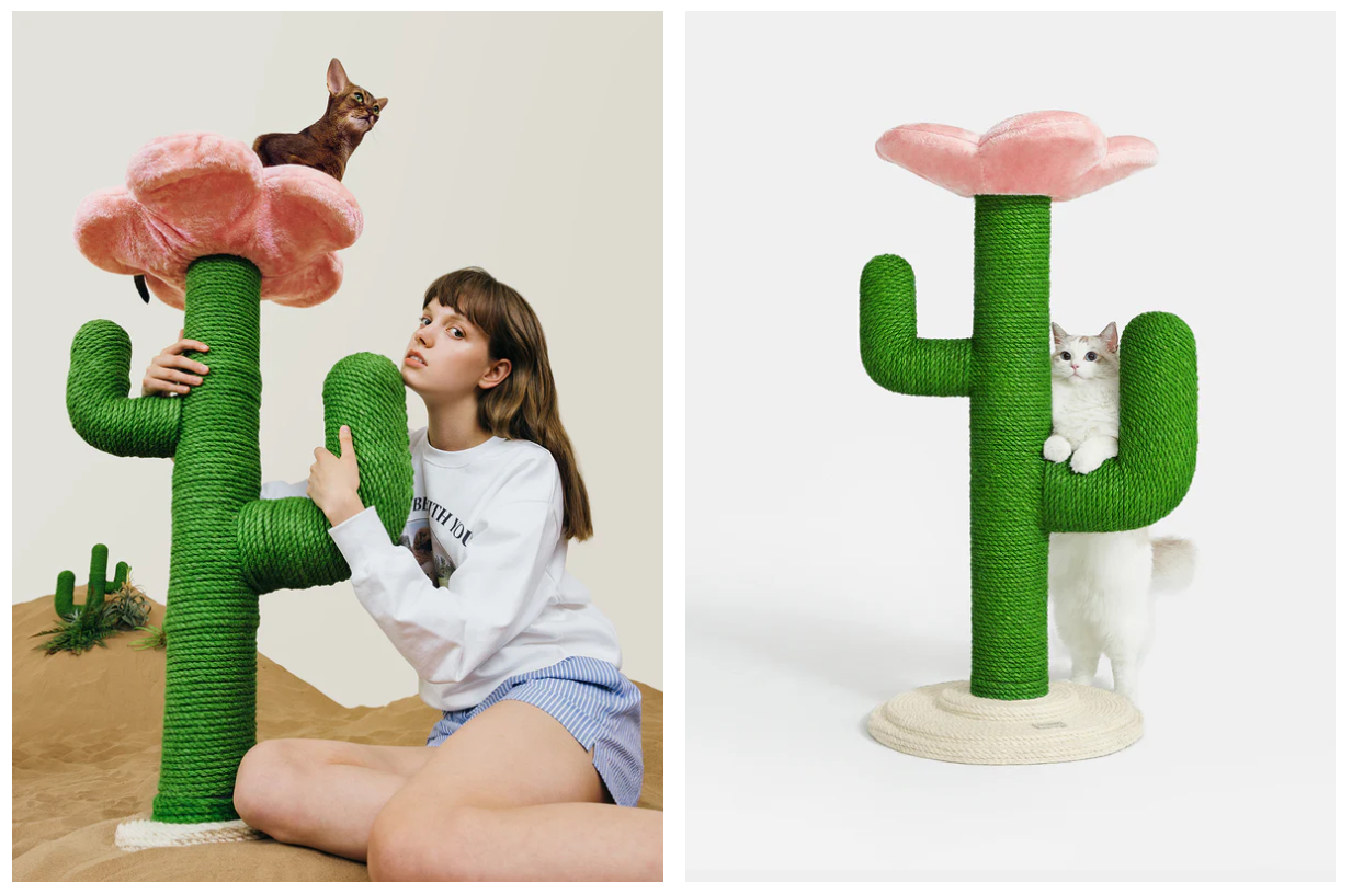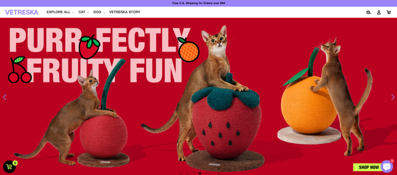 所以,Vetreska品牌选择以“宠物生活方式”为核心,将目标锁定北美中产阶级和独居青年。这类人群不仅购买力强,更倾向于通过宠物用品表达个人审美。品牌将樱桃、仙人掌、草莓、花朵等自然元素融入猫爬架、宠物碗等产品设计当中,搭配高饱和度的色彩,创造出兼具艺术感和实用性的“宠物家具”。