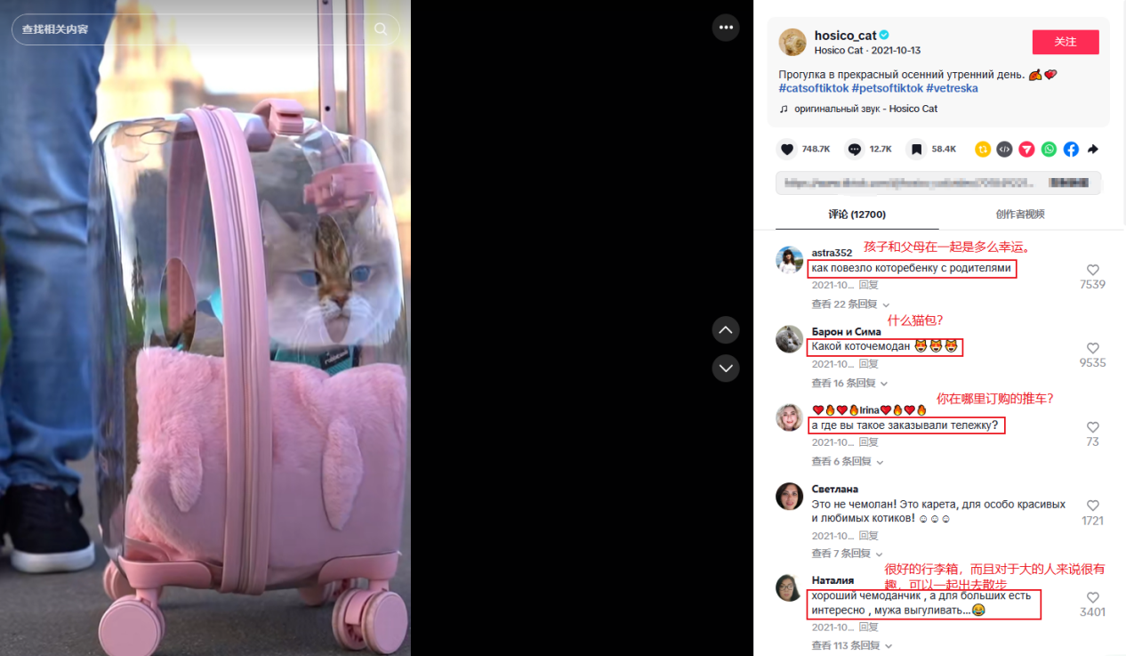 不少用户在视频下方留言“孩子和父母在一起是多么幸运。”“很好的行李箱,而且对于大的人来说很有趣,可以一起出去散步……”甚至还有被种草的潜在消费者询问“什么猫包?”“你在哪里订购的推车?”