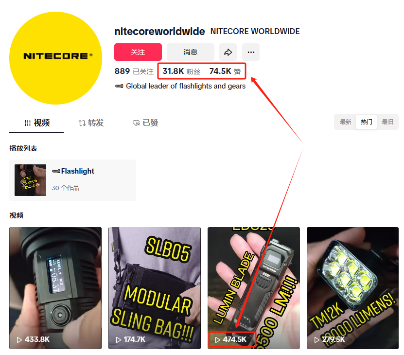 在TikTok上,Nitecore通过官方账号@nitecoreworldwide建立了稳定的内容输出渠道。该账号目前拥有3.18万粉丝,累计获得7.45万点赞。账号内容主要围绕产品功能演示展开,包括手电筒光照效果展示、产品细节特写、户外环境实测等,通过直观的视觉呈现让用户快速了解产品优势。