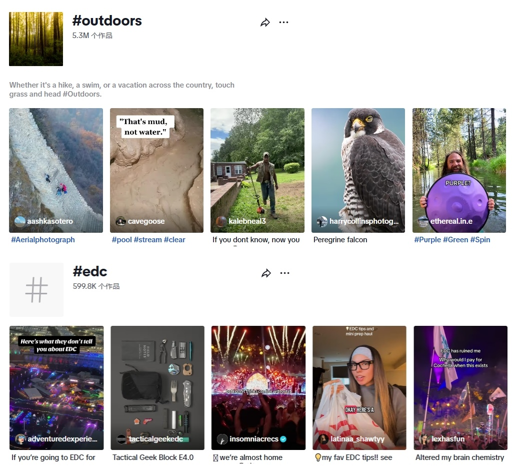 在内容传播策略上,Nitecore充分利用了平台热门标签的流量红利。通过持续使用#outdoors和#edc这两个累计播放量达1109亿次的热门标签,品牌内容获得了更多曝光机会。这种标签策略在提升视频推荐权重的同时,还激发了用户自发分享产品使用体验,形成了良性的传播循环。