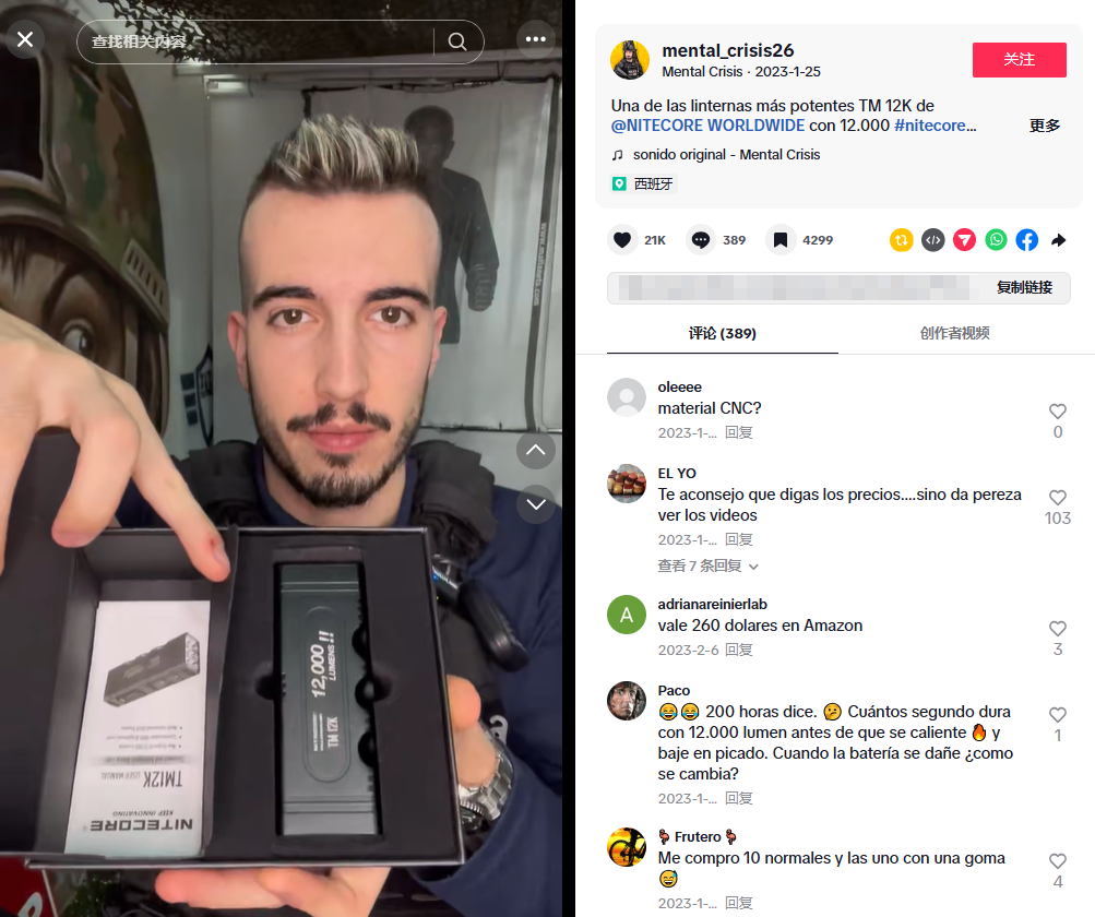 此外,Nitecore还与垂直领域的KOL展开合作。例如与92.41万粉丝的军事领域达人@mental_crisis26合作发布的测评视频,完整展示了Nitecore TM12K手电在夜间户外的使用效果。这条开箱测评视频最终获得43.37万次播放和2.1万次点赞,成功触达了更多军事爱好者。