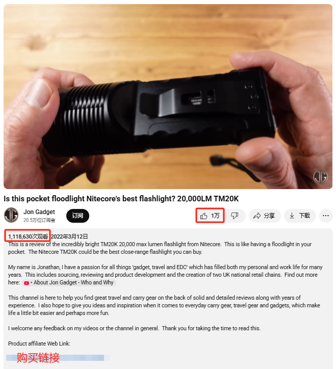 为此,Nitecore选择了与英国知名EDC装备测评博主Jon Gadget合作。这位拥有20.5万粉丝的创作者以客观严谨著称,在EDC爱好者群体中具有很强公信力。双方合作的TM20K手电测评视频长达18分钟,从产品参数讲解到夜间实景测试,完整呈现了这款升级版手电的各项性能特点。