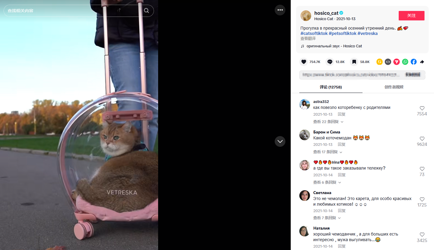 宠物品牌Vetreska深谙此道,他们专注于制作宠物垂直领域内容,与达人@hosico_cat合作拍摄橘猫使用透明猫包的日常视频。这种精准定位的内容获得了75.47万点赞,评论区充满了"哪里可以购买"的询盘。证明垂直内容能有效建立用户心智连接,关键在于找到目标用户的核心兴趣点,持续产出他们真正关心的内容,而非盲目追求泛流量。