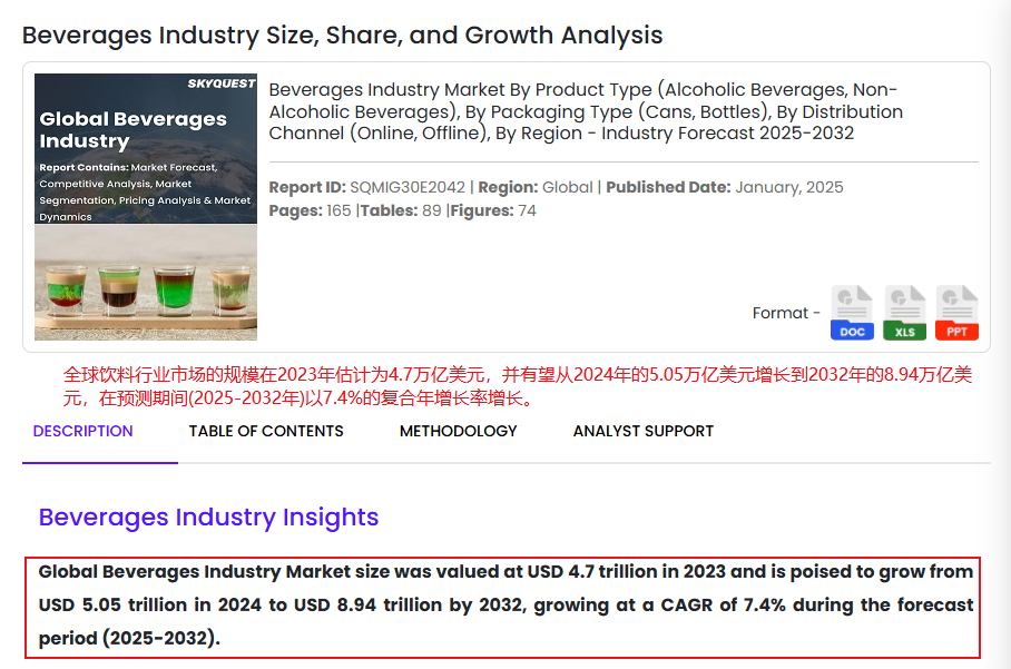 据SkyQuest Technology的数据显示,2023年全球饮料行业市场的规模估计为4.7万亿美元,预计在2025-2032年以7.4%的复合年增长率增长,到2032年将达到8.94万亿美元。