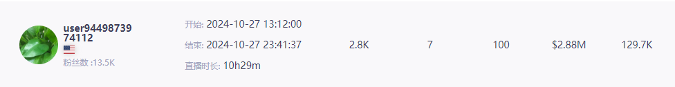 例如,达人@user9449873974112便与该品牌合作进行了直播带货。在一场10小时29分钟的直播里,共吸引了2800人前来观看,预估售出12.97万件商品,取得的成绩很亮眼!