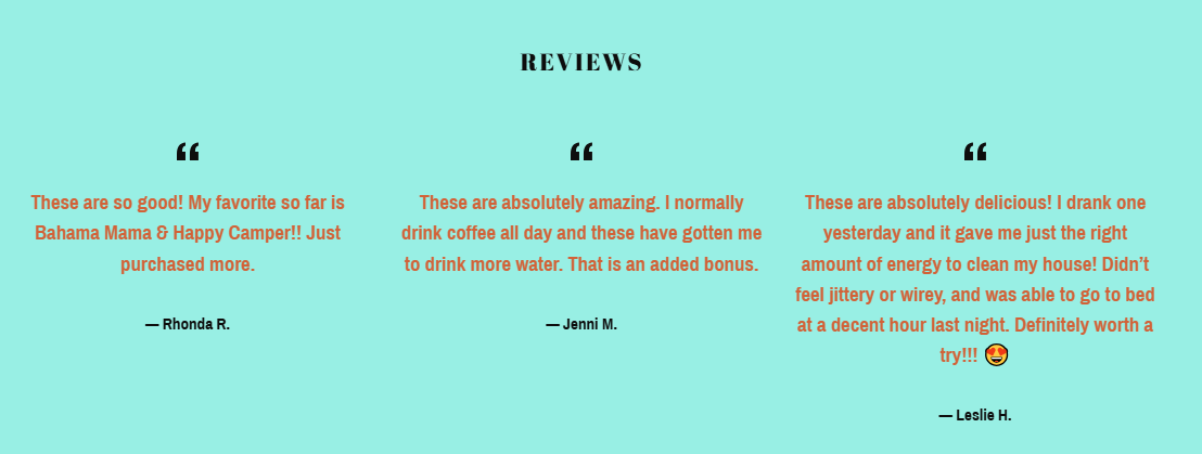 不仅详细展示产品成分和冲泡方法,还设立了用户评价专区,真实的好评如“这些真的太棒了。我通常一整天都喝咖啡,这些让我喝更多的水。这是一个额外的奖励。”“这些绝对美味!我昨天喝了一杯,它给了我恰到好处的能量来打扫我的房子!没有感到紧张或不安,昨晚还能在适当的时间上床睡觉。绝对值得一试~”等等,也为潜在消费者提供了可信的参考,拉近了与用户之间的距离。