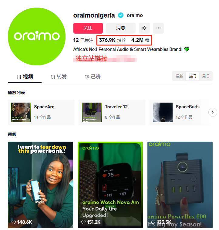 在品牌营销上,Oraimo同样下了大功夫,以TikTok为例,他们摸索出了一套接地气的打法。目前该品牌运营着11个地区账号,其中尼日利亚官方账号@oraimonigeria粉丝超37万,视频获赞量达420万,成为非洲最活跃的消费电子账号之一。