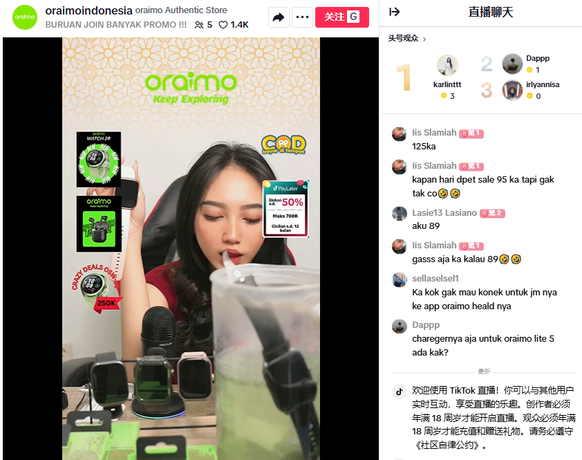 直播带货是Oraimo的重点策略。在非洲和东南亚市场,他们采用本土主播+达人带货的模式,通过TikTok Shop直播展示产品性能。比如主播会现场演示耳机的防水功能,或者测试续航时间,同时配合限时折扣提升转化。2023年,Oraimo在TikTok印尼站的单场直播销售额最高突破10万美元,部分爆款耳机单月销量增长200%。在印尼市场,他们还将TikTok短视频与Shopee直播打通,形成引流闭环。