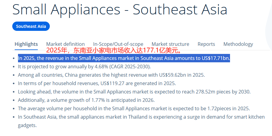 东南亚市场正在经历一场消费升级。随着城镇化快速推进和中产阶级的不断壮大,当地消费者对生活品质的要求越来越高,小家电市场从而迎来了爆发式增长。数据显示,到2025年,东南亚小家电市场规模将突破177.1亿美元,而且这个增长趋势还在持续。