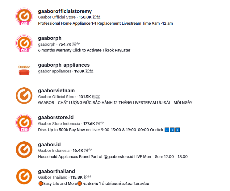 其中,TikTok是Gaabor重点押注的主战场,他们在不同国家开设了本地化账号,形成了品牌账号矩阵。目前,Gaabor在菲律宾、印尼、泰国、越南等多个国家的TikTok账号分别积累了75.47万、17.76万、11.58万和10.15万粉丝,全平台总粉丝量超过100万,累计曝光数亿次。