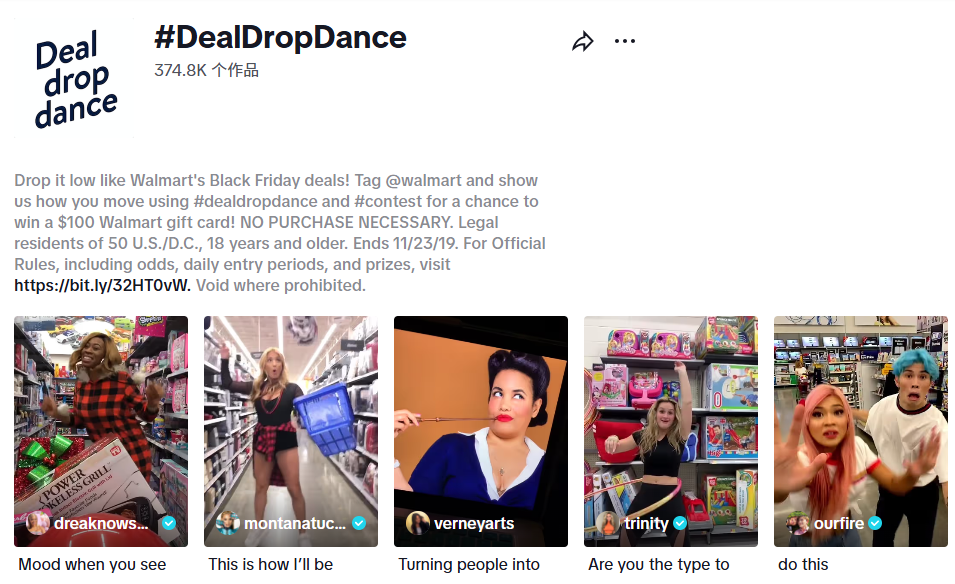 甚至沃尔玛这样的零售巨头也在“跟风”。他们发起#DealDropDance挑战赛,邀请用户拍摄在超市过道跳舞的视频,最终覆盖1700万粉丝,用娱乐化内容模糊了广告与社交的边界。