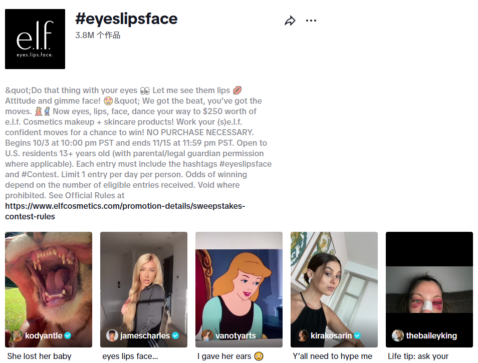 而美妆品牌e.l.f.的做法则更是“简单粗暴”,他们发现用户在TikTok上自发创作了300万条品牌相关视频后,直接以品牌全名#eyelipsface发起挑战赛,最终收获70亿次观看,甚至让活动主题曲冲上Spotify榜单第四。