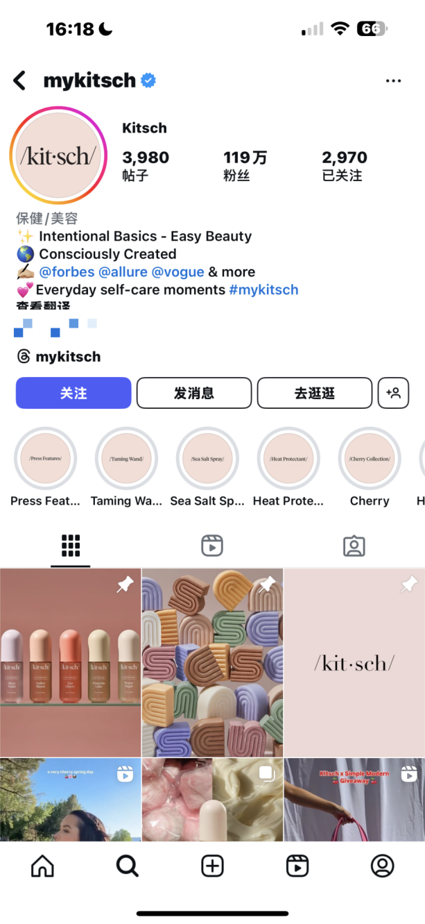 与TikTok的流量铺设推广不同,Kitsch品牌在Instagram的运营始终围绕“视觉叙事”展开。账号主页数据显示,品牌累计发布3980条帖子,吸引了119万粉丝关注。