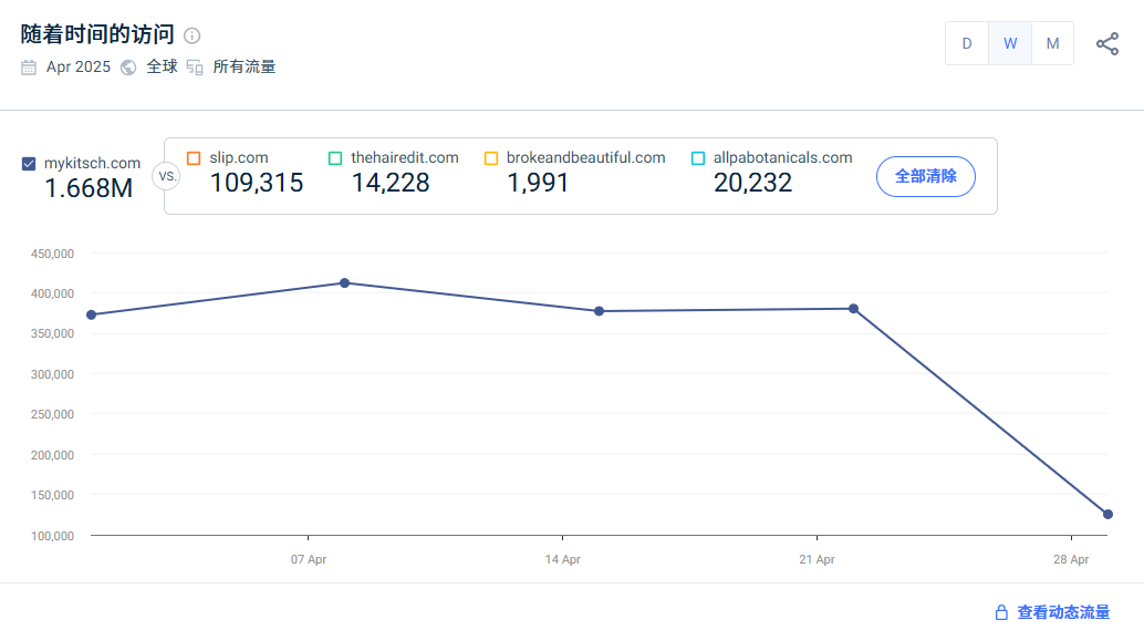 Kitsch品牌独立站不仅是销售渠道,更是品牌体验中心。截至2025年4月,通过会员体系、限时联名款首发和用户UGC征集,其站点总访问量达166.8万次,尽管环比下降22.7%,仍以绝对优势领跑同赛道。