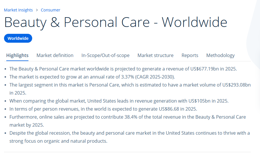 根据第三方平台数据,全球美容和个人护理市场预计在2025年将产生6771.9亿美元的收入,市场预计将以每年3.37%的复合年增长率(2025-2030年)增长。