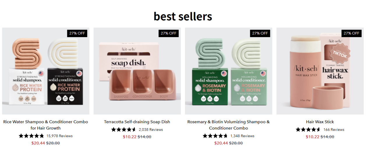 2023年,其全球销售额达1.2亿美元,同比增长25%,线上渠道占比65%,独立站月访问量超百万次。品牌核心产品如缎面无热卷发套装、固态洗发水等,长期位列亚马逊畅销榜,TikTok话题#kitsch累积超6.13万个作品,成为Z世代“健康护发”的代名词。