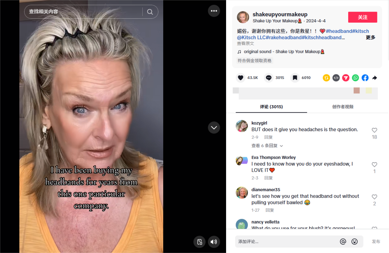 以TikTok达人@shakeupyourmakeup为例,该达人虽然只有7.35万粉丝,但在与Kitsch品牌的合作过程中创下了单条视频1250万流量的纪录,为品牌带来了不错的流量与关注。
