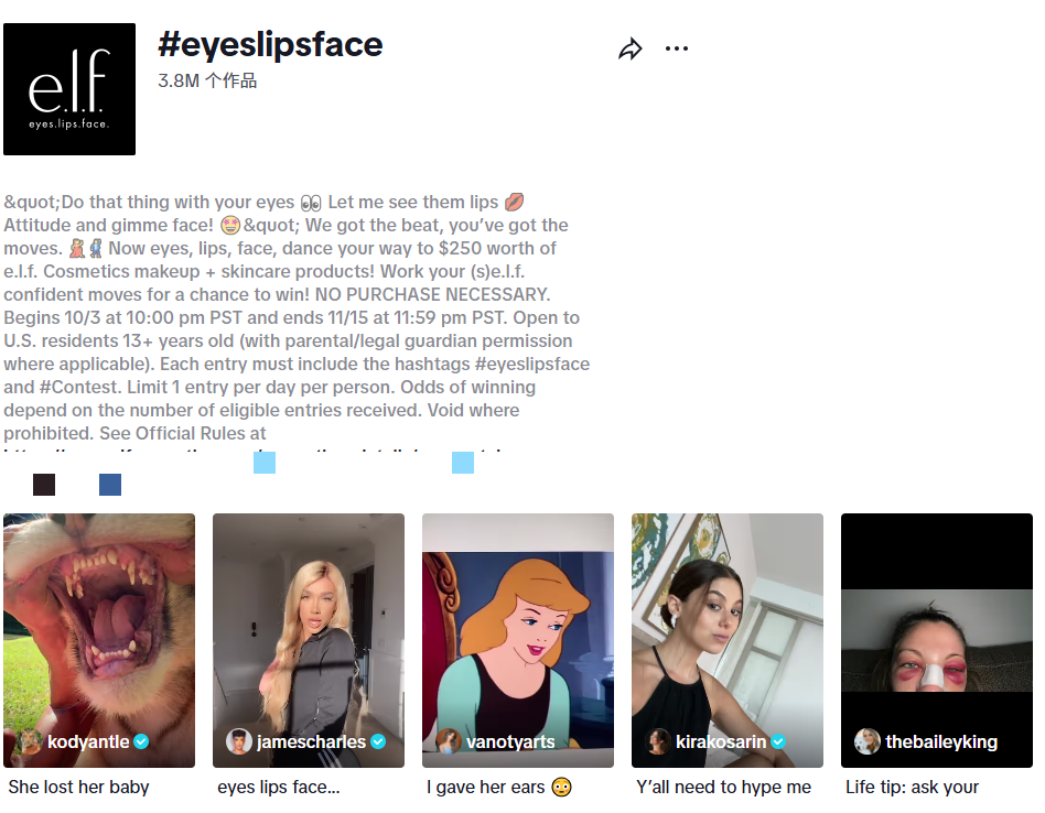 而美国平价彩妆品牌e.l.f.的翻红更显草根智慧。当团队发现TikTok上自发出现300多万条用户分享其产品的视频时,果断抓住契机发起#eyeslipsface商业挑战赛。