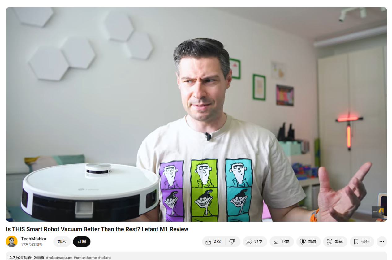 拥有17万订阅者的科技达人TechMishka便是品牌的合作者之一,其为Lefant品牌的M1扫地机器人拍摄了一条深度开箱及实测视频。到现在为止,这个视频已经有3.7万次观看。