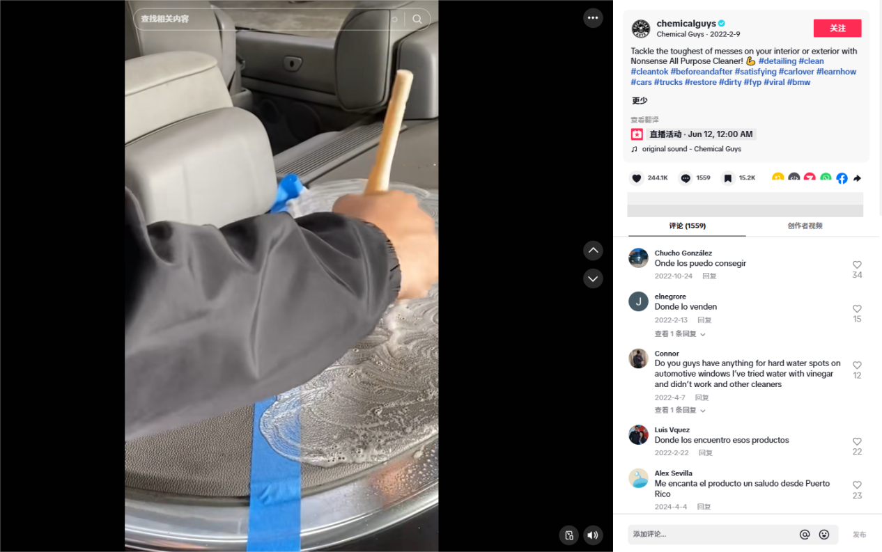 因此,在账号@chemicalguys的视频里,常常以员工或真实用户演示产品使用过程和效果为主,例如在2022年2月发布的一条清洁剂使用对比视频,通过真实的对比演绎该视频获得了1130万播放量,充分证明了真实场景内容的强大吸引力。