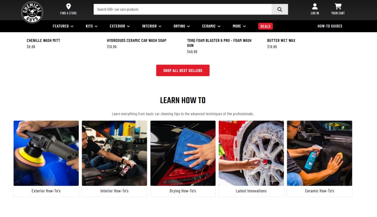为了提升用户粘性和转化率,Chemical Guys品牌独立站以“汽车护理一站式解决方案”为定位来进行打造,看似是对汽车护理问题答疑,实则在其中将产品进行软植入,加强用户购买意愿。