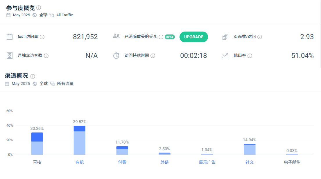 根据数据显示,2025年5月访问量超82万,有机流量占39.52%,直接访问流量也达到30.26%,两者合计贡献了超过69.7%的访问量,整体流量结构十分健康。