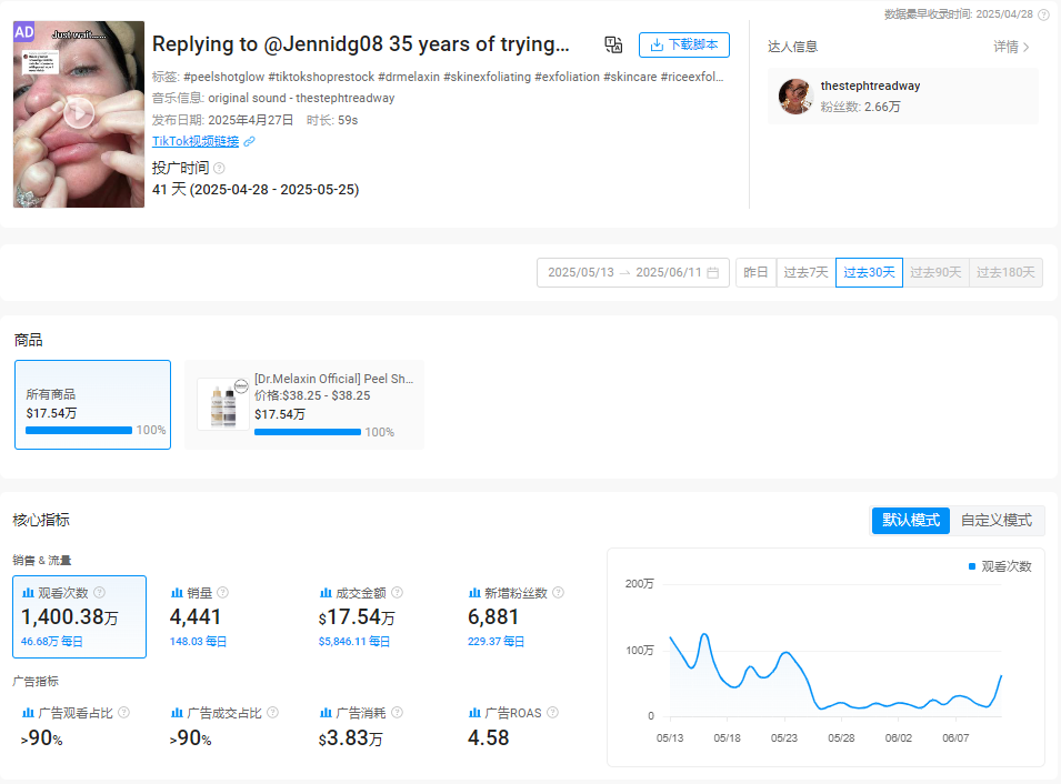 例如,一位名为@thestephtreadway的素人博主在4月27日发布的一条使用演示视频,单条视频GMV就达到17.54万美元,30天卖出超4400单,播放量高达1400万,点赞数超过20万。