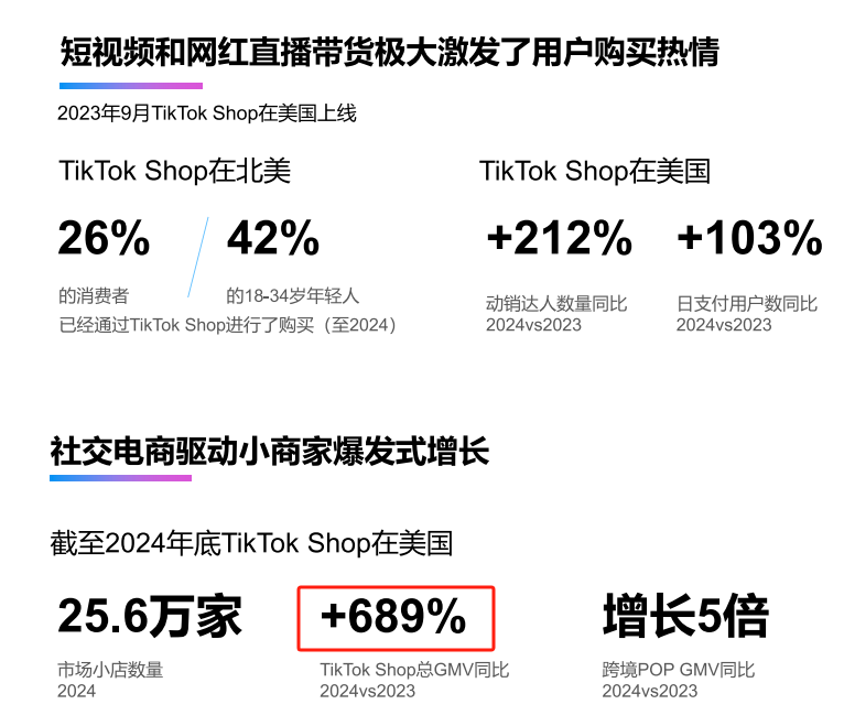 与此同时,社交电商的快速崛起,使得其成为了Z世代等年轻群体的重要购物场景。据悉,TikTok Shop在美国市场GMV同比增长高达689%,日支付用户增长超100%,18-34岁用户中,已有42%通过该平台完成了购买。