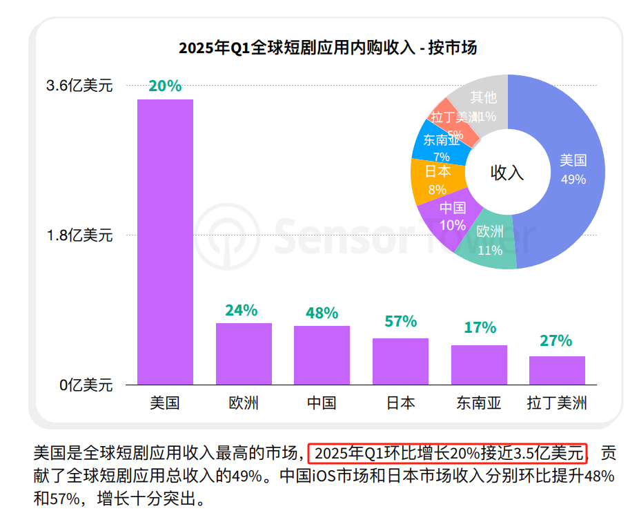 在所有市场中,美国是短剧App当前最重要的收入来源,2025年Q1单季内购收入达3.5亿美元,占全球总收入的49%。相对成熟的移动支付环境与内容付费习惯,使得在美国市场跑出付费转化路径的产品更容易获得资本与运营支持。