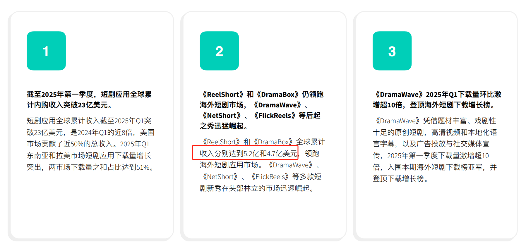 2025年Q1,《ReelShort》和《DramaBox》依旧是海外短剧市场的收入与活跃用户榜头部。