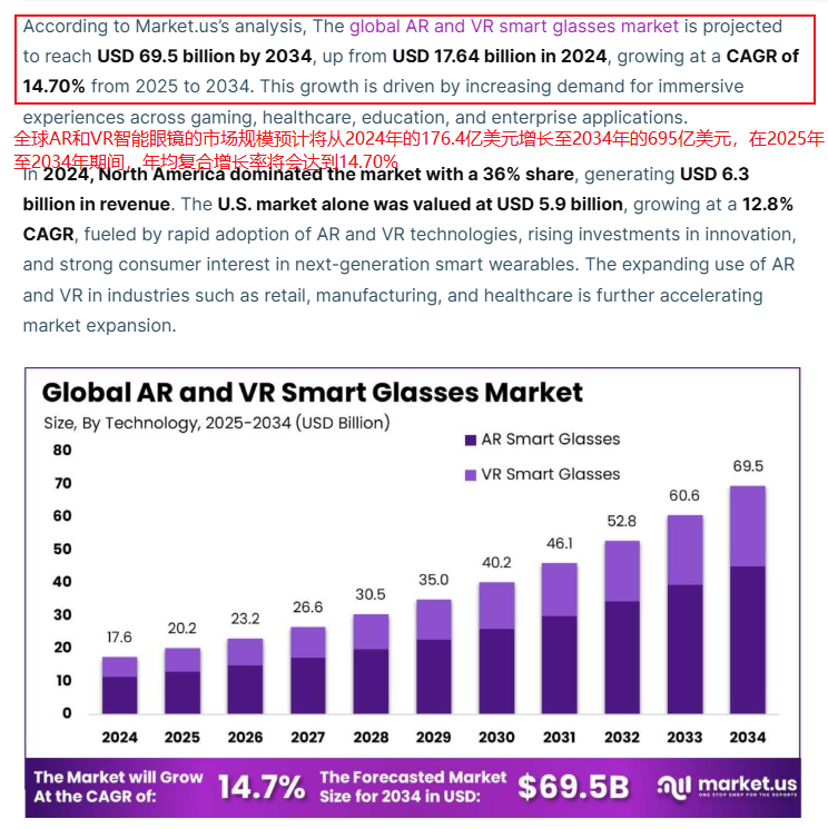 据Market.us数据显示,全球AR和VR智能眼镜的市场规模,预计将从2024年的176.4亿美元增长至2034年的695亿美元。在2025年至2034年期间,年均复合增长率将会达到14.70%。