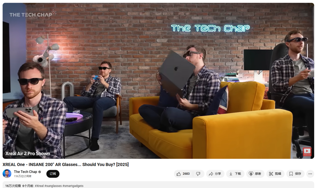 拥有156万订阅者的科技博主The Tech Chap就是合作者之一,其为XREAL One这款AR眼睛拍摄了一条详细的实测视频。截至目前,观看量达到了16万次。