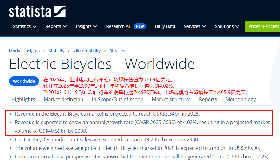 据statista数据显示,在2025年,全球电动自行车的市场规模估值为333.4亿美元。预计在2025年至2030年之间,将以4.02%的年均复合增长率保持稳定增长。到2030年时,全球电动自行车的销量将达到4920万辆、市场规模有望增长至约405.9亿美元。