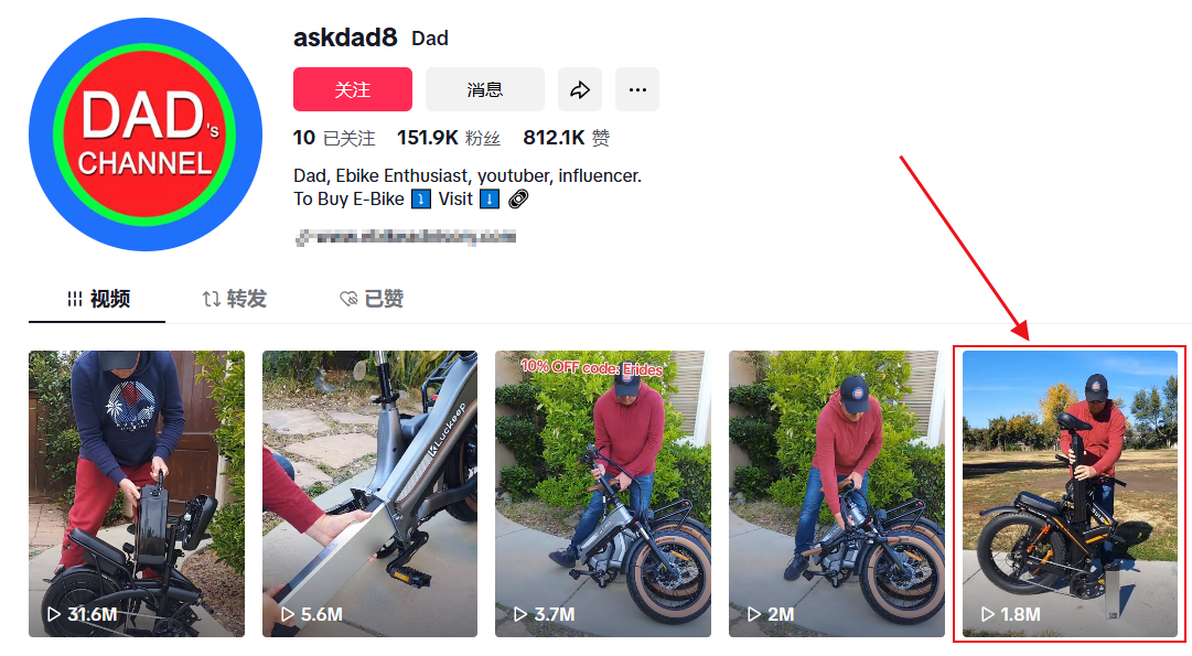 拥有15.19万粉丝的TikTok科技达人@askdad8,便为Engwe品牌的x24电动自行车拍摄了推广短视频。